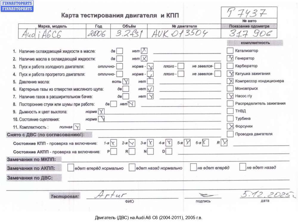 | Ярославль | 2006 | 06E100031, 2006, 3.2л, Бензин, FSI, BKH, BKH040914, 06E100031, Универсал, серый, Фото не актуально, с запчасти отделены: Генератор, Форсунка топливная, Заслонка дроссельная, Коллектор впускной, Насос гидроусилителя руля (ГУР), Компрессор кондиционера, ТНВД, Насос вакуумный, Катушка зажигания, Катушка зажигания, Катушка зажигания, Катушка зажигания, Катушка зажигания, Катушка зажигания, BKH040914 | - , прокручивается, состояние ГРМ - нормально, поддон - нормально, клапанная крышка - нормально, эмульсия - нет, *,, * | |||